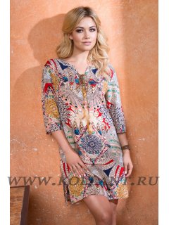 Туника средней длины (до колен) прямого силуэта с круглым вырезом горловины на полочке и спинке из вискозы с фантазийным принтом. Модель с втачными широкими рукавами и боковыми разрезами. Круглый вырез горловины полочки и спинки обработан притачной фигурной обтачкой. V-образный разрез на горловине полочки обработан притачной планкой. Планка туники декорирована контрастным тонким шнурком с кисточками, который продергивается через люверсы.