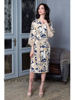 Халат средней длины (до колен) прямого силуэта, из принтованного тонкого крепа, с карманами в боках. Модель с втачными рукавами 3/4, низ рукавов декорированы широким кружевом. Халат завязывается на пояс из однотонного крепа и внутреннюю завязку. Состав 100% полиэстер
