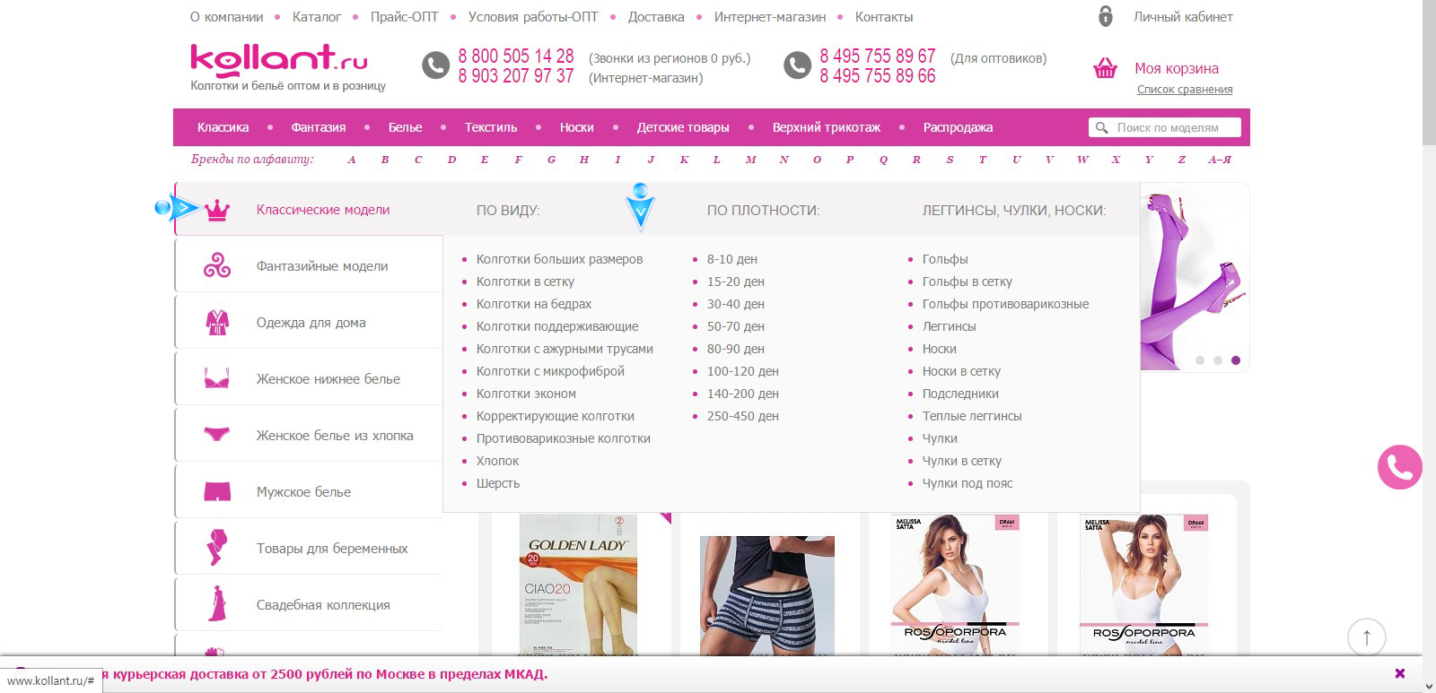 Уважаемые покупатели! Компания Kollant - один из крупнейших оптовых продавцов чулочно-носочной продукции в Москве, предлагает Вашему вниманию огромный товарный ассортимент по самым выгодным ценам. С недавнего времени мы вышли на розничный рынок, создав собственный интернет-магазин по продаже колготок, чулок и женского белья. Для Вашего удобства мы создали подробную инструкцию по покупке наших товаров.У нас всегда широкий выбор классических и фантазийных колготок для всех времен года, на любой вкус и цвет! Цветные колготки и чулки, ажурные, гипюровые, с люрексом - всегда можно подобрать и купить в нашем интернет- магазине, не выходя из дома! Узнайте больше о лучших мировых производителях чулочно-носочных изделий прямо на нашем сайте!